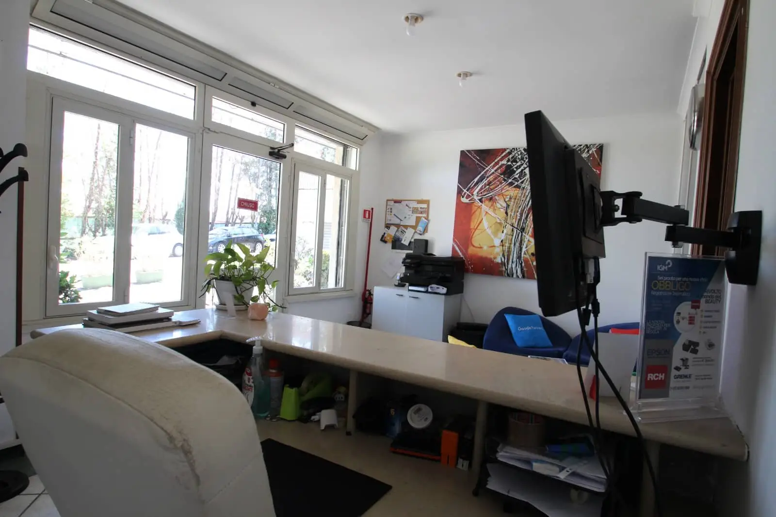 A soli 15 Km da Roma e precisamente nella cittadina di Monterotondo, proponiamo in vendita locale al piano terra nella zona residenziale di Santa Maria. L’immobile è costituito da un’ampia porta d’ingresso con vetrate ed internamento è diviso in 3 comodi ambienti con bagno. Dotato di inverter caldo/freddo e serranda elettrica. Si presenta parzialmente arredato con due scrivanie e 4 poltrone. Ideale per studi professionali, centri estetici ecc.